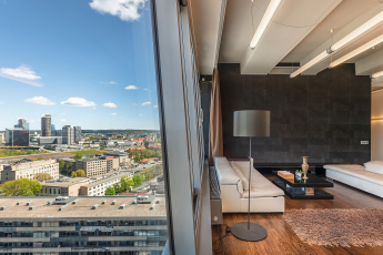 Finansuojami 126.71 m² ploto apartamentai įsikūrę 15 aukšte su puikiu vaizdu į visas pagrindines Vilniaus miesto vietas. Šis pilnai įrengtas butas orientuotas į ilgalaikę nuomą ir nutolęs vos kelių minučių atstumu pėsčiomis nuo Lietuvos Respublikos Seimo.
